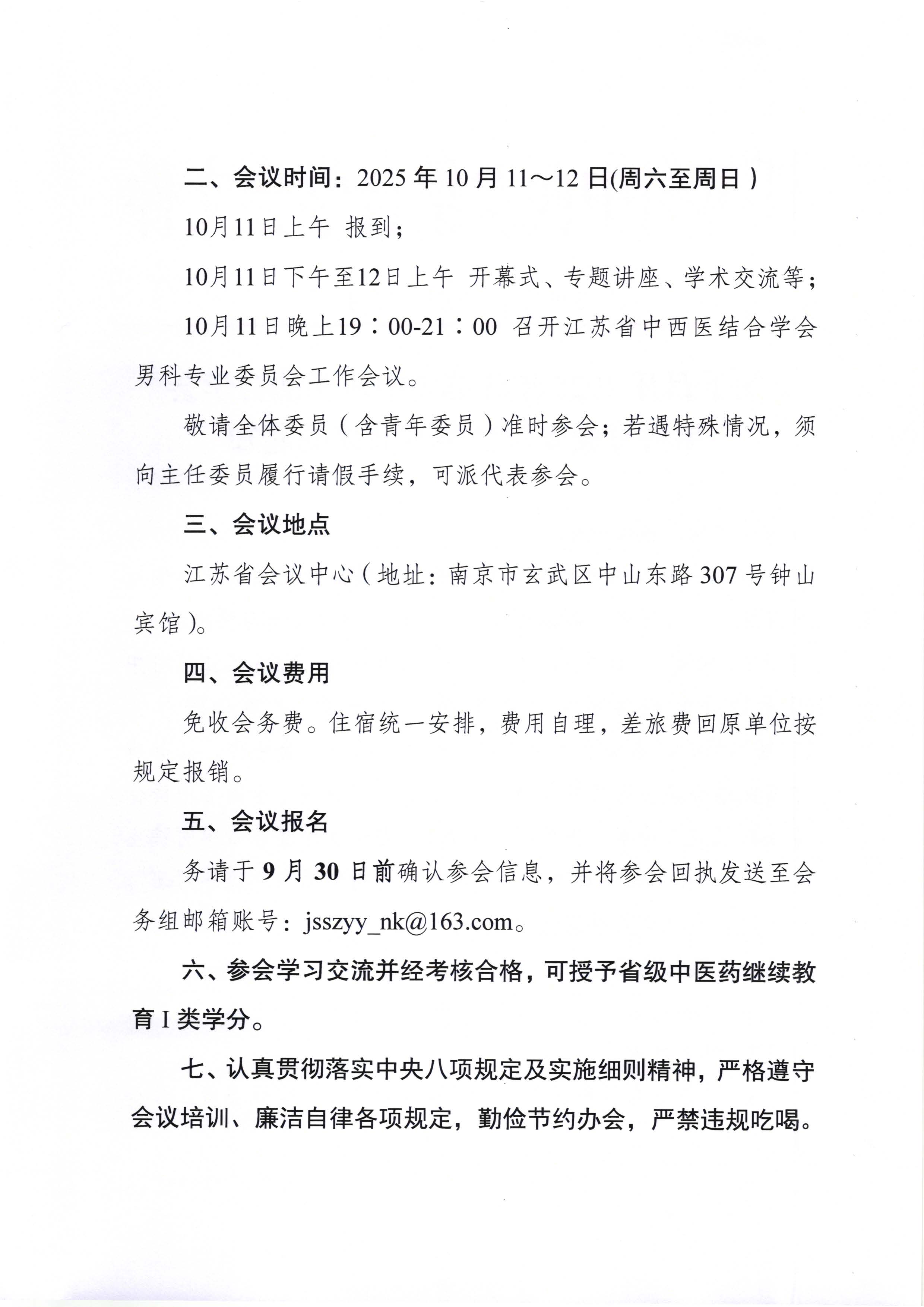 关于召开2025年江苏省中西医结合学会男科专业委员会学术会议的通知