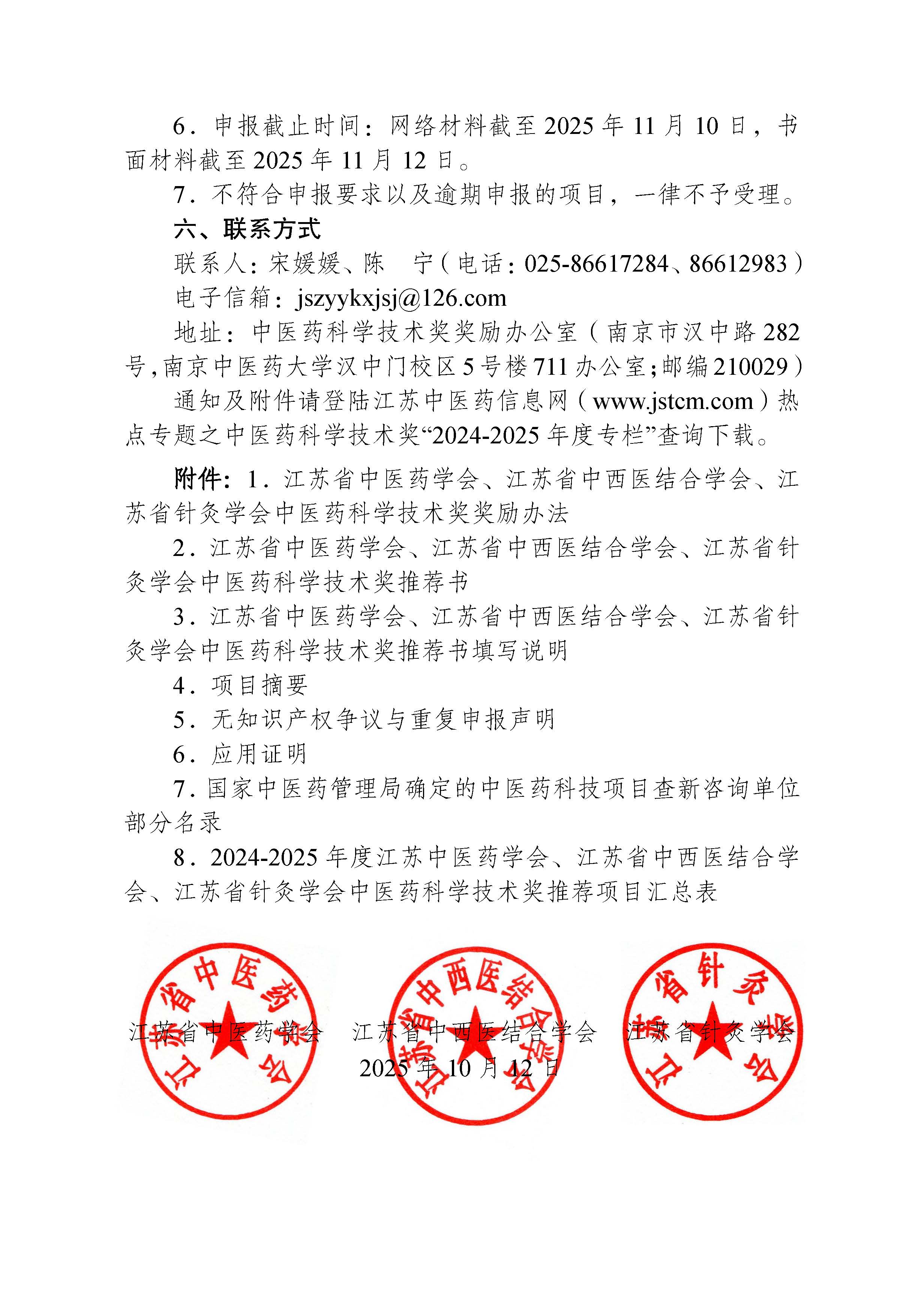 关于2024-2025年度江苏省中医药学会、江苏省中西医结合学会、江苏省针灸学会中医药科学技术奖推荐工作的通知