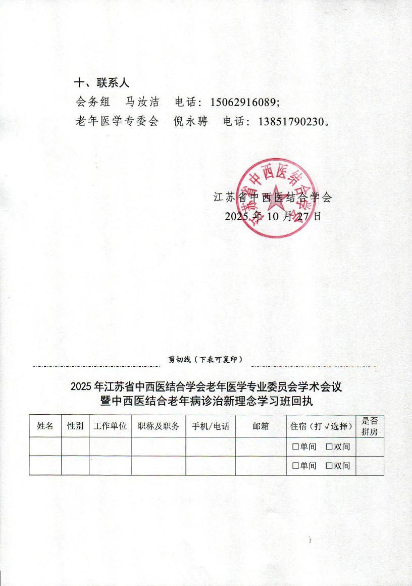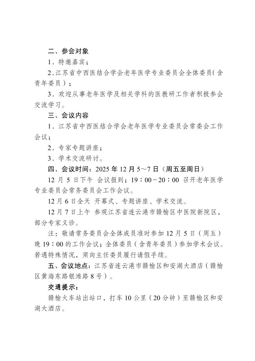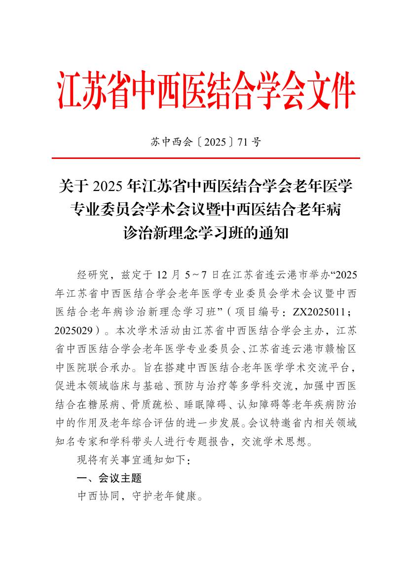 关于2025年江苏省中西医结合学会老年医学专业委员会学术会议暨中西医结合老年病诊治新理念学习班的通知