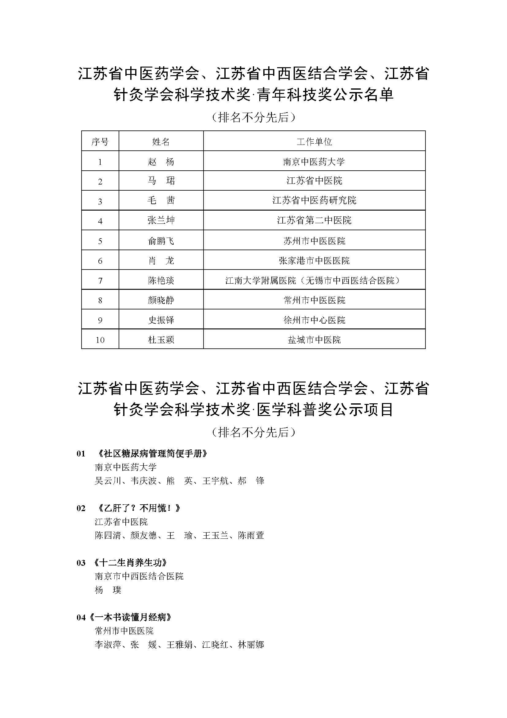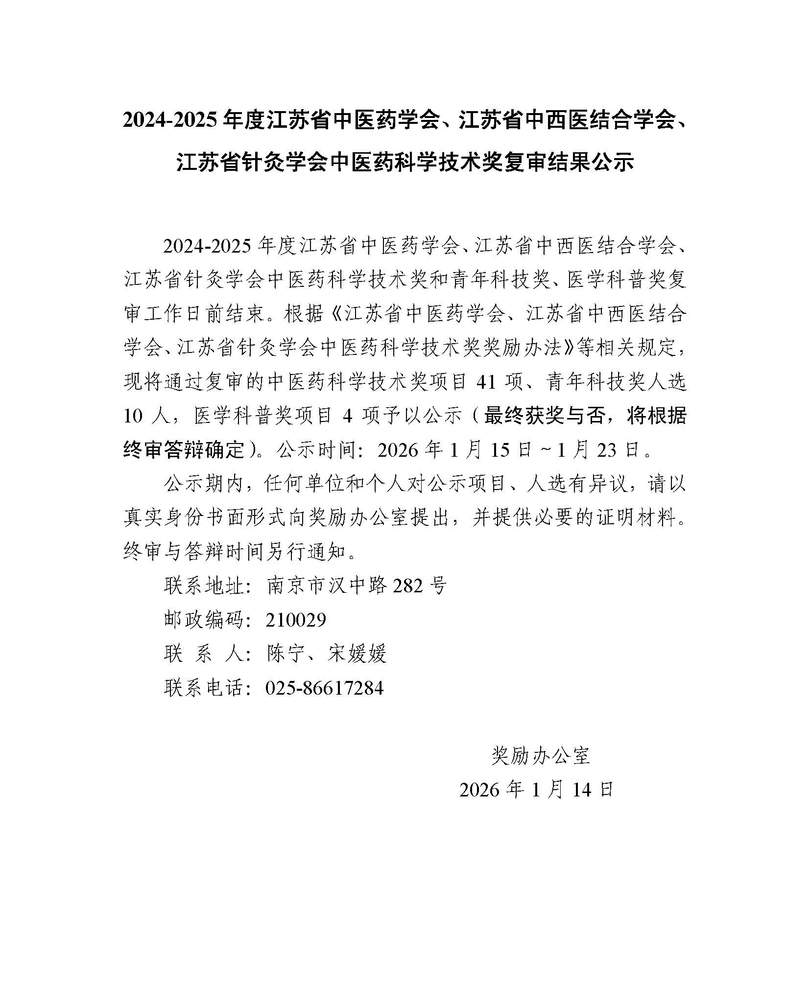 2024-2025年度江苏省中医药学会、江苏省中西医结合学会、江苏省针灸学会中医药科学技术奖复审结果公示