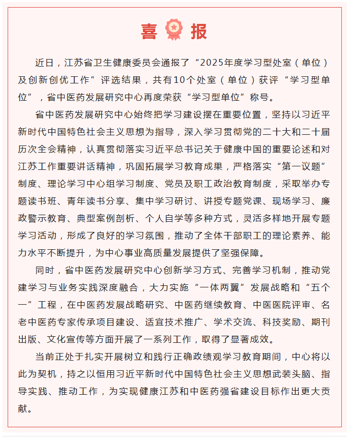 喜报:省中医药发展研究中心再度获评省卫生健康委“学习型单位”