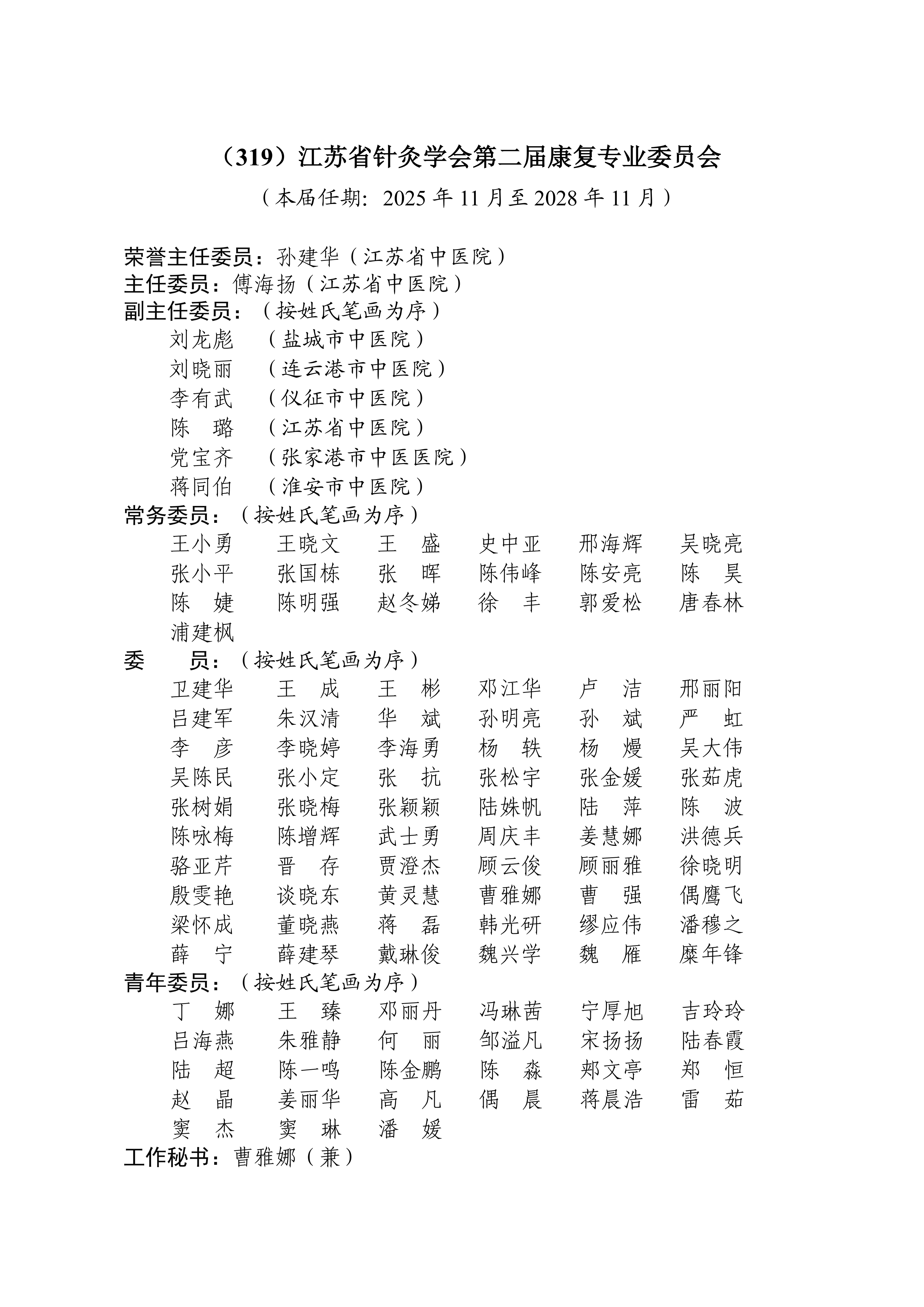 首页 >> 学会之窗 >> 江苏省针灸学会 >> 专业委员会名称与成员 >> 319康复专业委员会