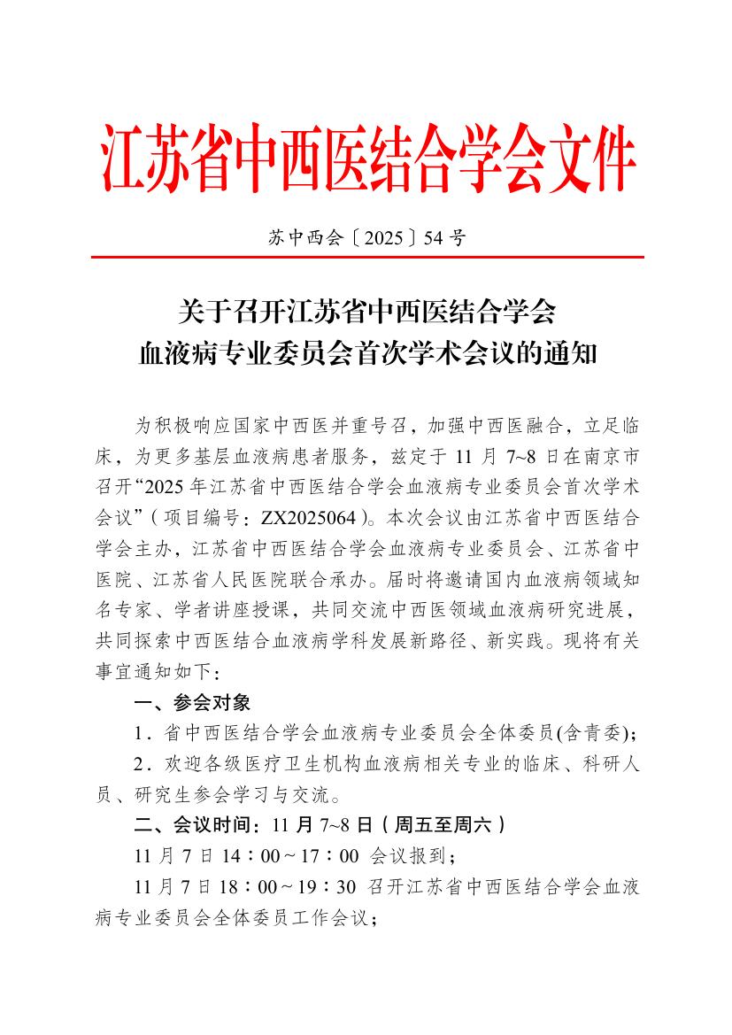 关于召开江苏省中西医结合学会血液病专业委员会首次学术会议的通知