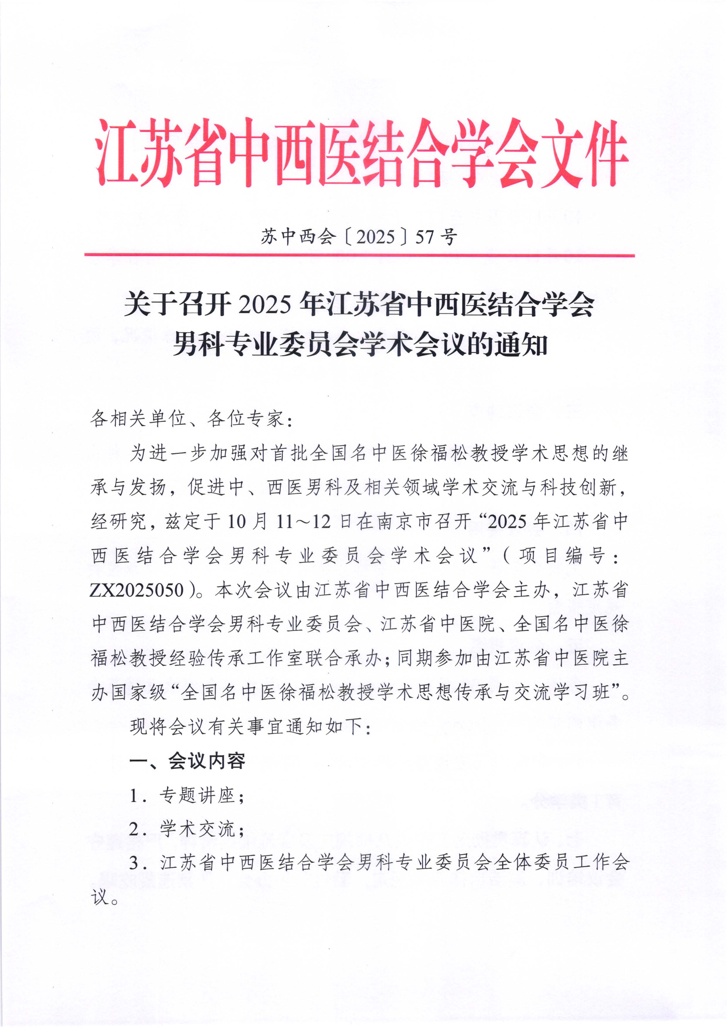 关于召开2025年江苏省中西医结合学会男科专业委员会学术会议的通知