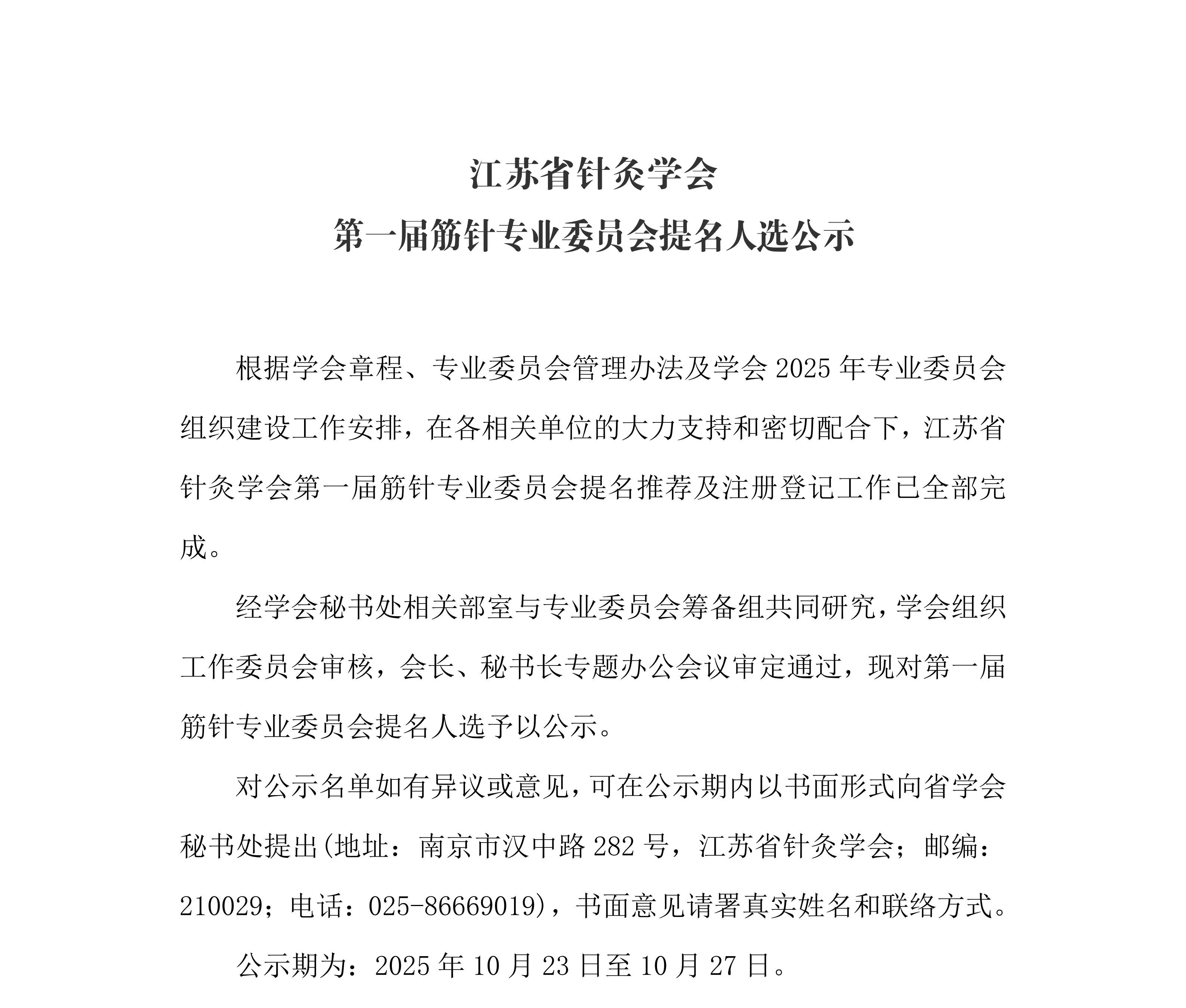 江苏省针灸学会第一届筋针专业委员会提名人选公示
