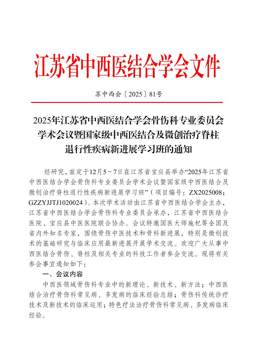 2025年江苏省中西医结合学会骨伤科专业委员会学术会议暨国家级中西医结合及微创治疗脊柱退行性疾病新进展学习班的通知