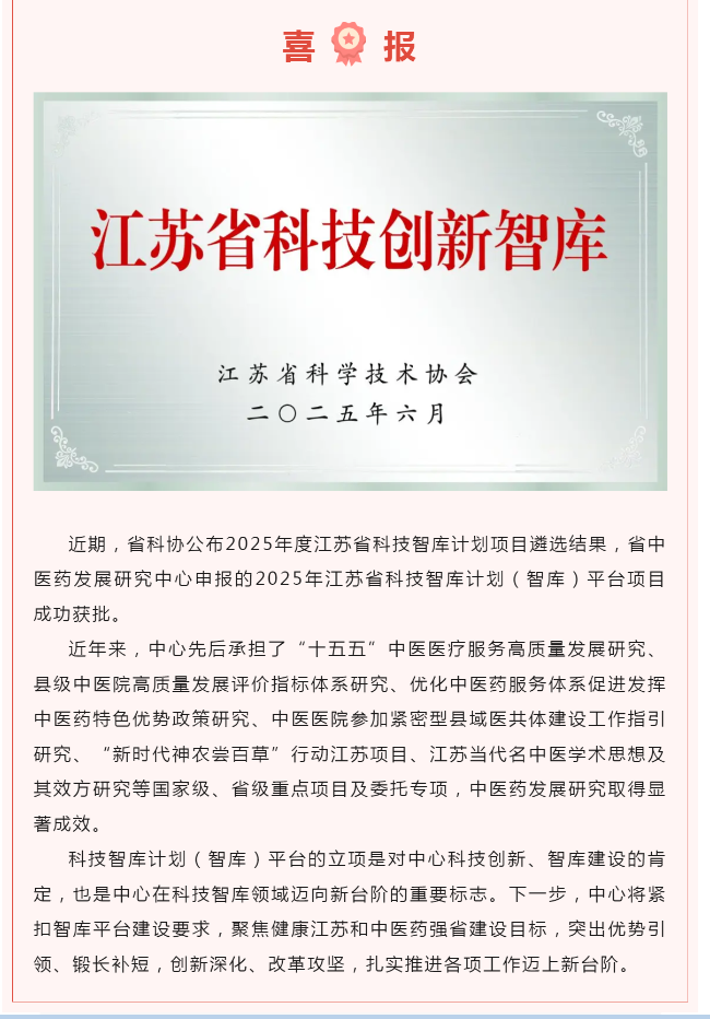 喜报 | 江苏省中医药发展研究中心入选2025年江苏省科技智库计划(智库)平台项目
