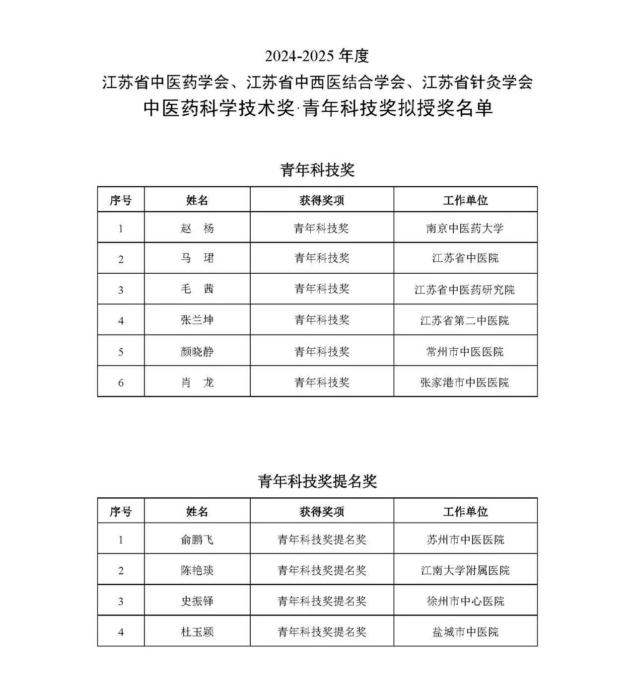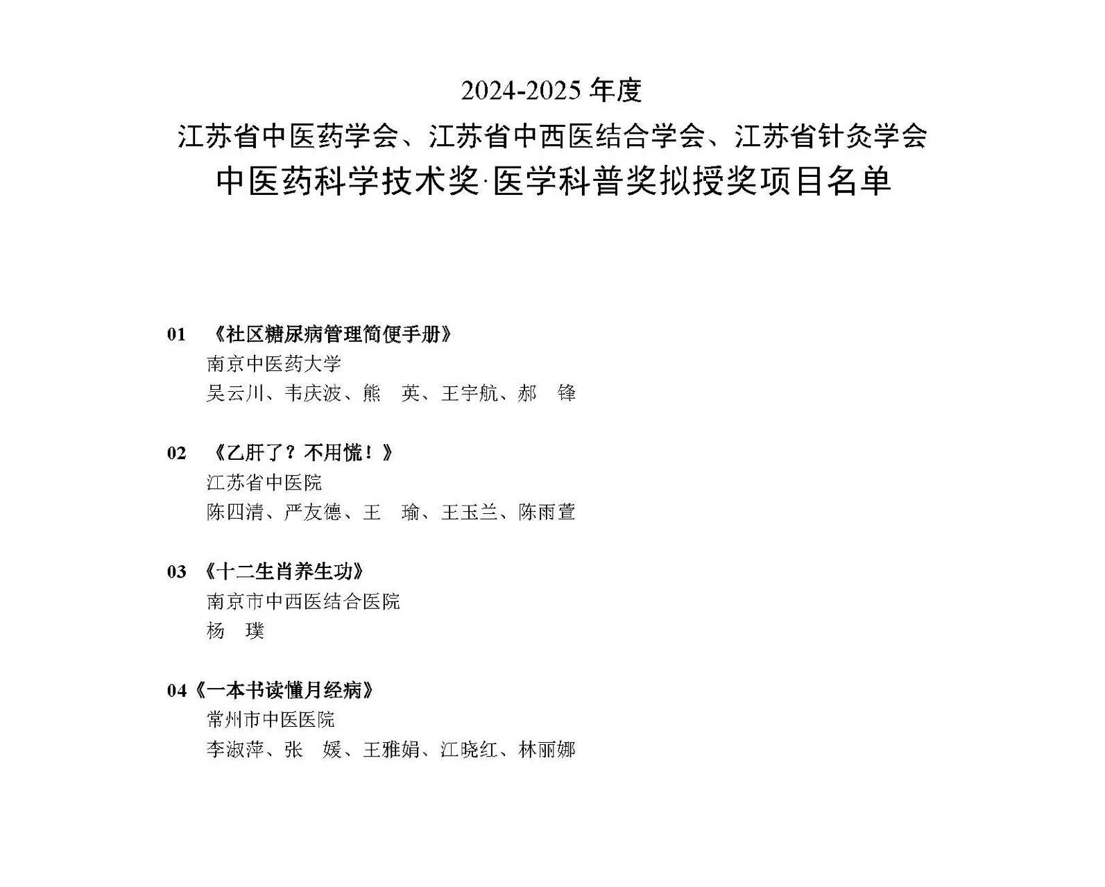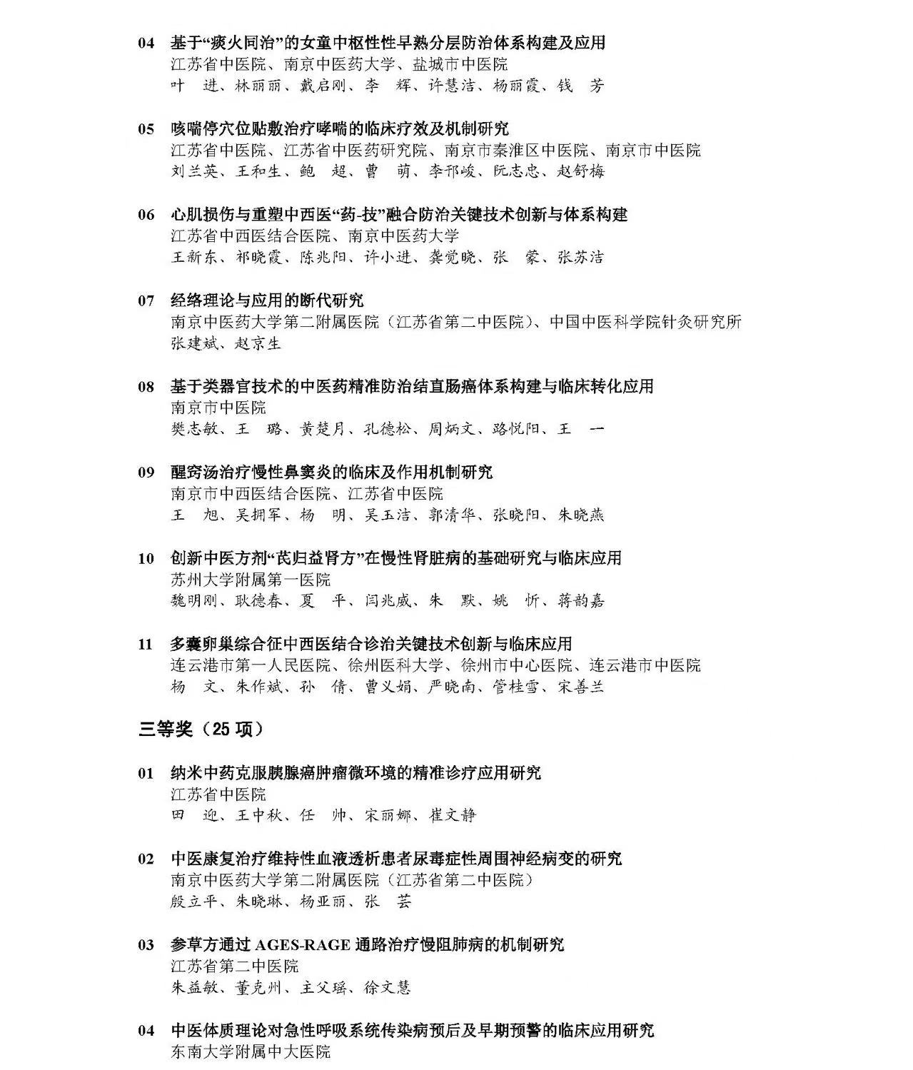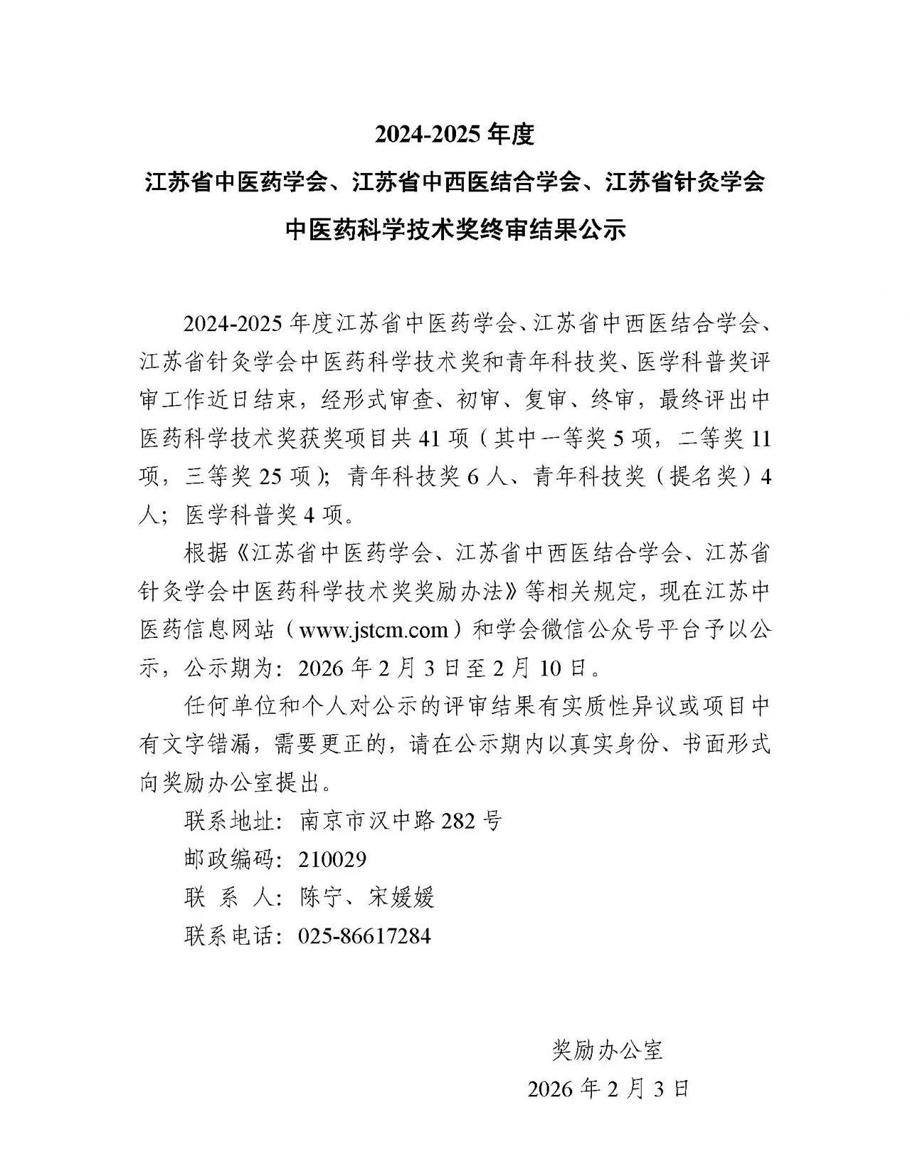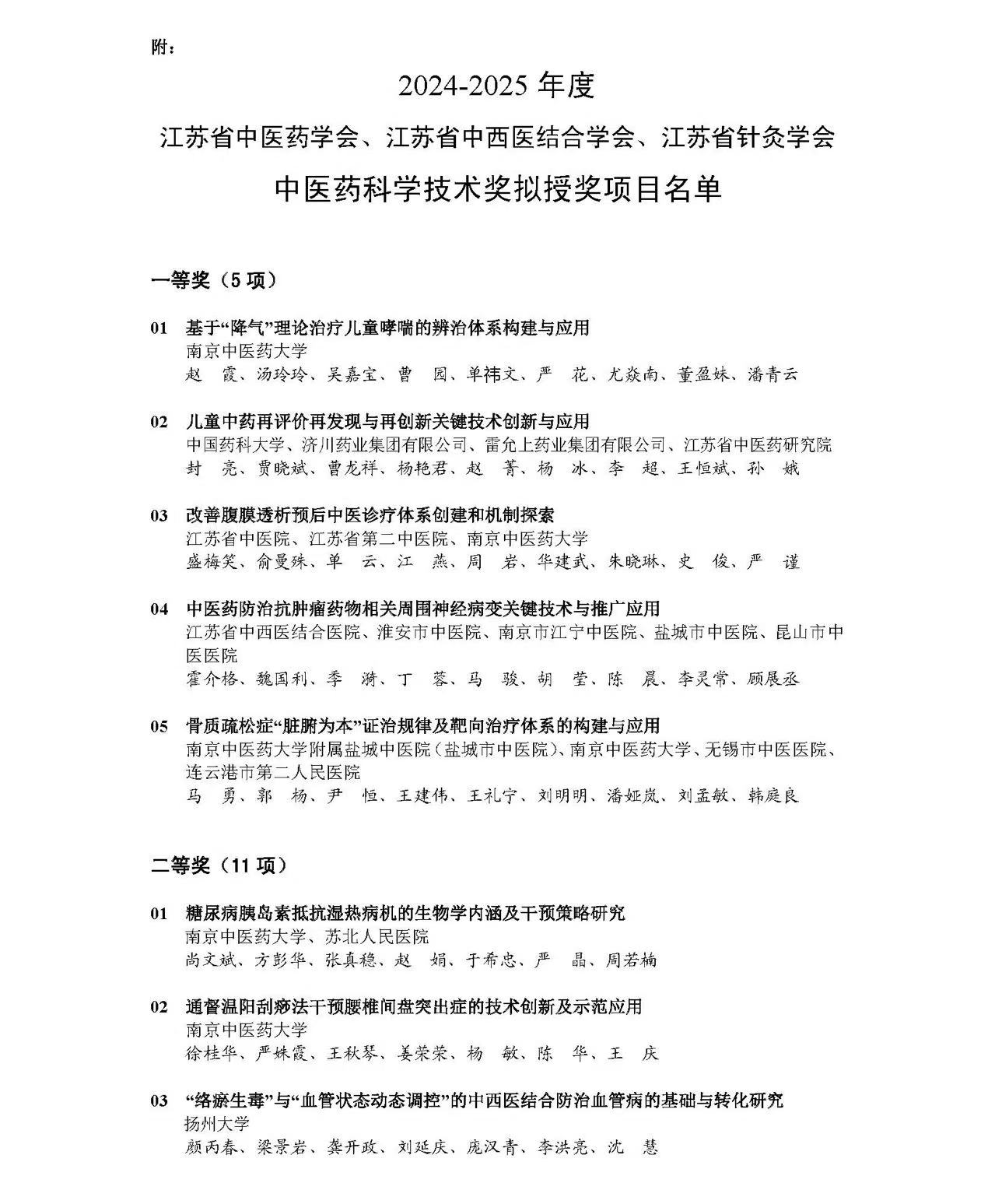 2024-2025年度 江苏省中医药学会、江苏省中西医结合学会、江苏省针灸学会 中医药科学技术奖终审结果公示